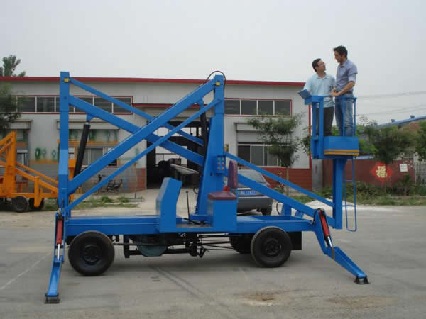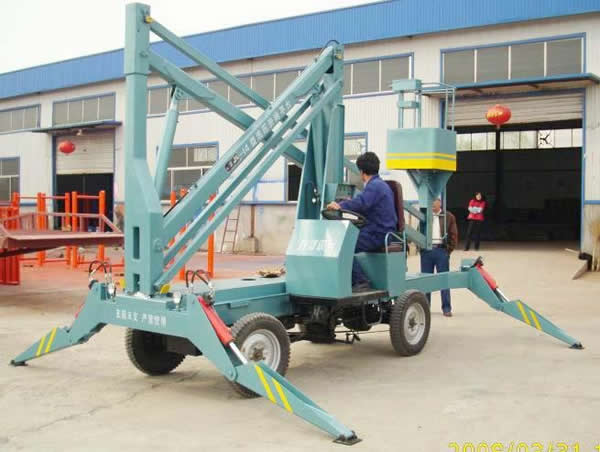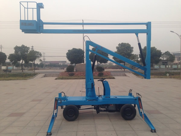曲臂式升降平台规格:外形尺寸:3900*2200*2900 (MM)台面尺寸:700*600(MM)主结构:采用Q235钢板(5 mm)对折焊接,旋转360度。液压支撑腿,驱动型式:自行式,启动方式: 电启动 发动机功率(HP): 12电源电压(V):12 支腿型式: 液压支撑 抗风能力: ≤5级